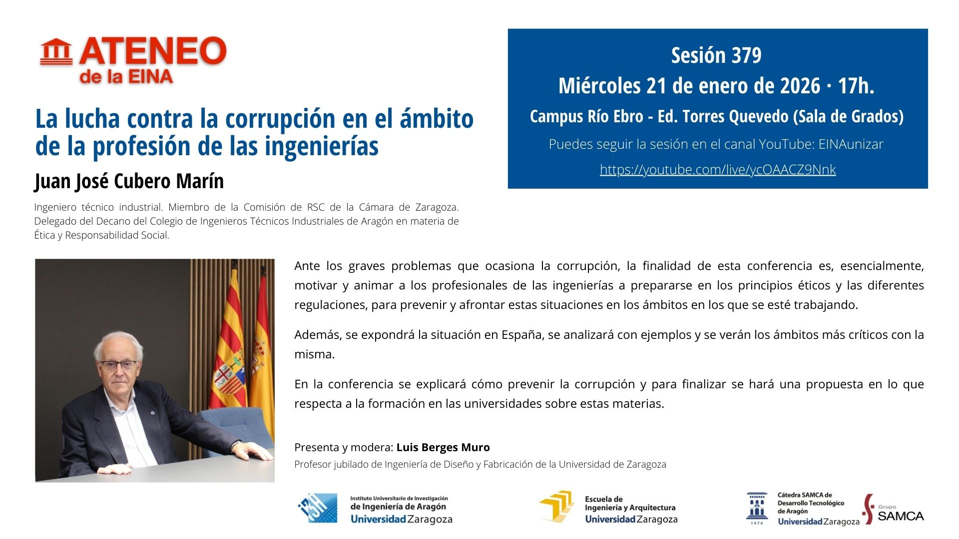 La primera sesión del Ateneo de la EINA del 2026 tendrá lugar el miércoles 21 de enero, a las 17h., y estará protagonizada por Juan José Cubero Marín (Ingeniero Técnico Industrial, miembro de la Comisión de RSC de Cámara de Zaragoza y delegado del Decano del Colegio de Ingenieros Técnicos Industriales de Aragón en materia de Ética y Responsabilidad Social).