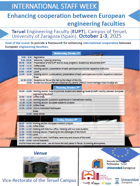 La Escuela Universitaria Politécnica de Teruel (EUPT) celebra del 1 al 3 de octubre la II International Staff Week. Alrededor de 60 asistentes pertenecientes a más de 35 universidades europeas participarán en estas jornadas, que cuentan con un intenso programa de trabajo y actividades de creación de redes. Las universidades participantes pertenecen a una variedad de países como Irlanda, Bélgica, Alemania, Finlandia, Francia, Polonia, Estonia, Portugal, Dinamarca, Lituania, Rumanía, Austria, Grecia, Bulgaria, Croacia, Letonia, Turquía y República Checa.