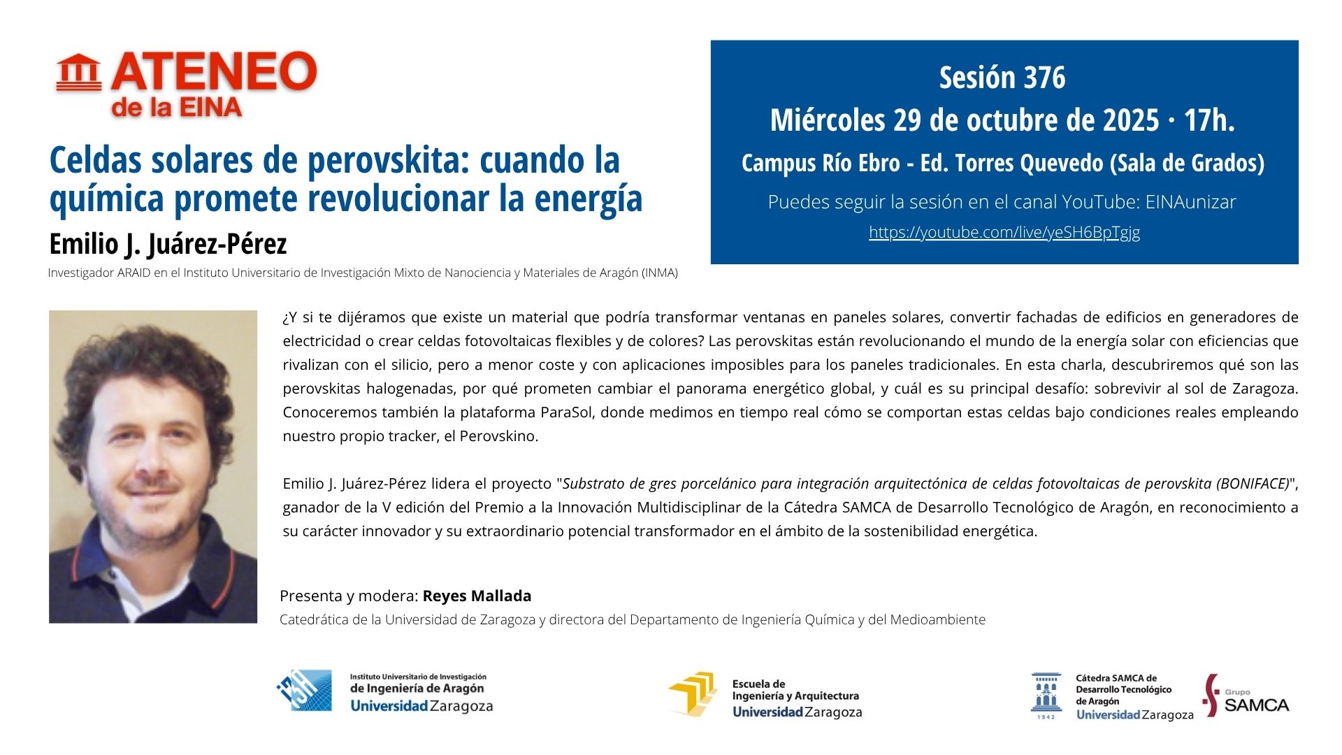 La próxima sesión del Ateneo de la EINA tendrá lugar el miércoles 29 de octubre, a las 17h., y contará con la participación como ponente invitado de Emilio J. Juárez-Pérez (investigador ARAID en el Instituto Universitario de Investigación Mixto de Nanociencia y Materiales de Aragón (INMA).
