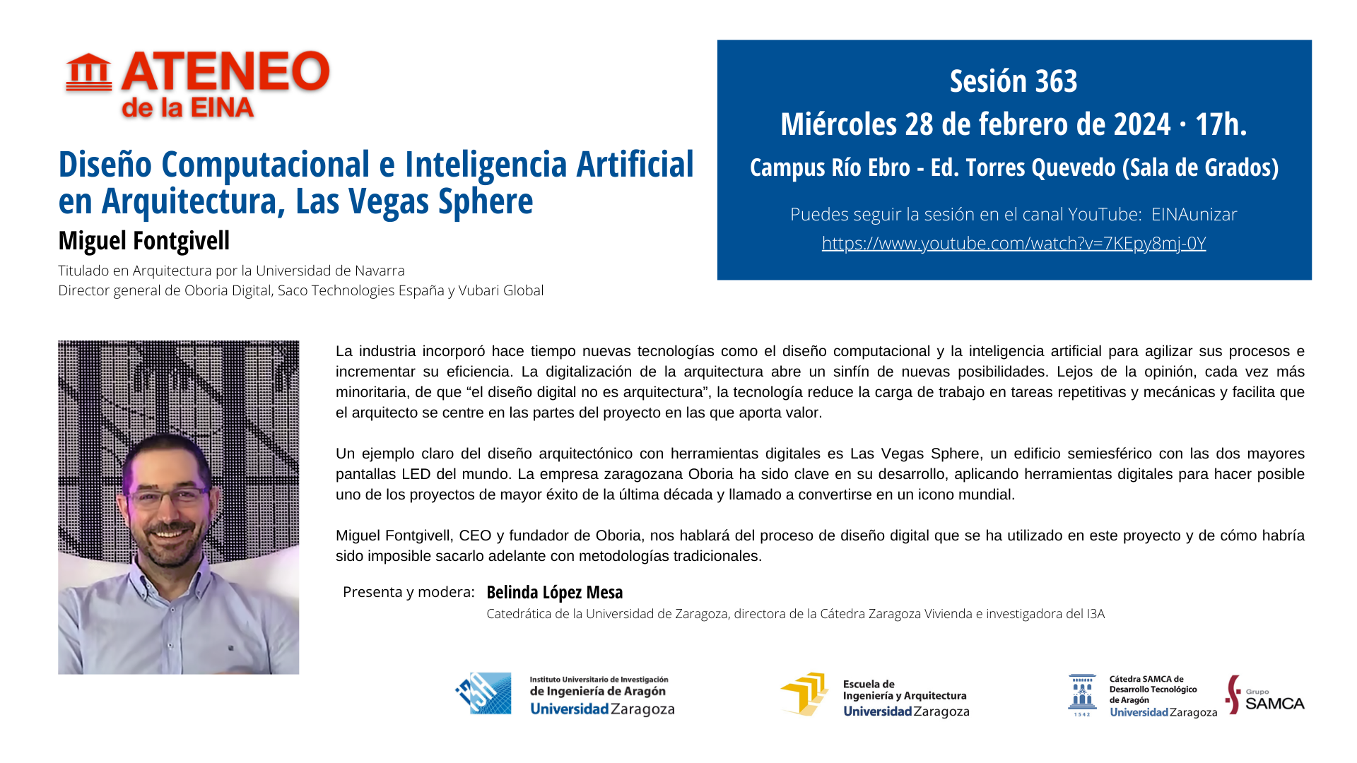 El miércoles 28 de febrero, a las 17 horas, el Ateneo de la EINA estará protagonizado por Miguel Fontgivell, titulado en arquitectura por la Universidad de Navarra y director general de Oboria Digital, Saco Technologies España y Vubari Global.