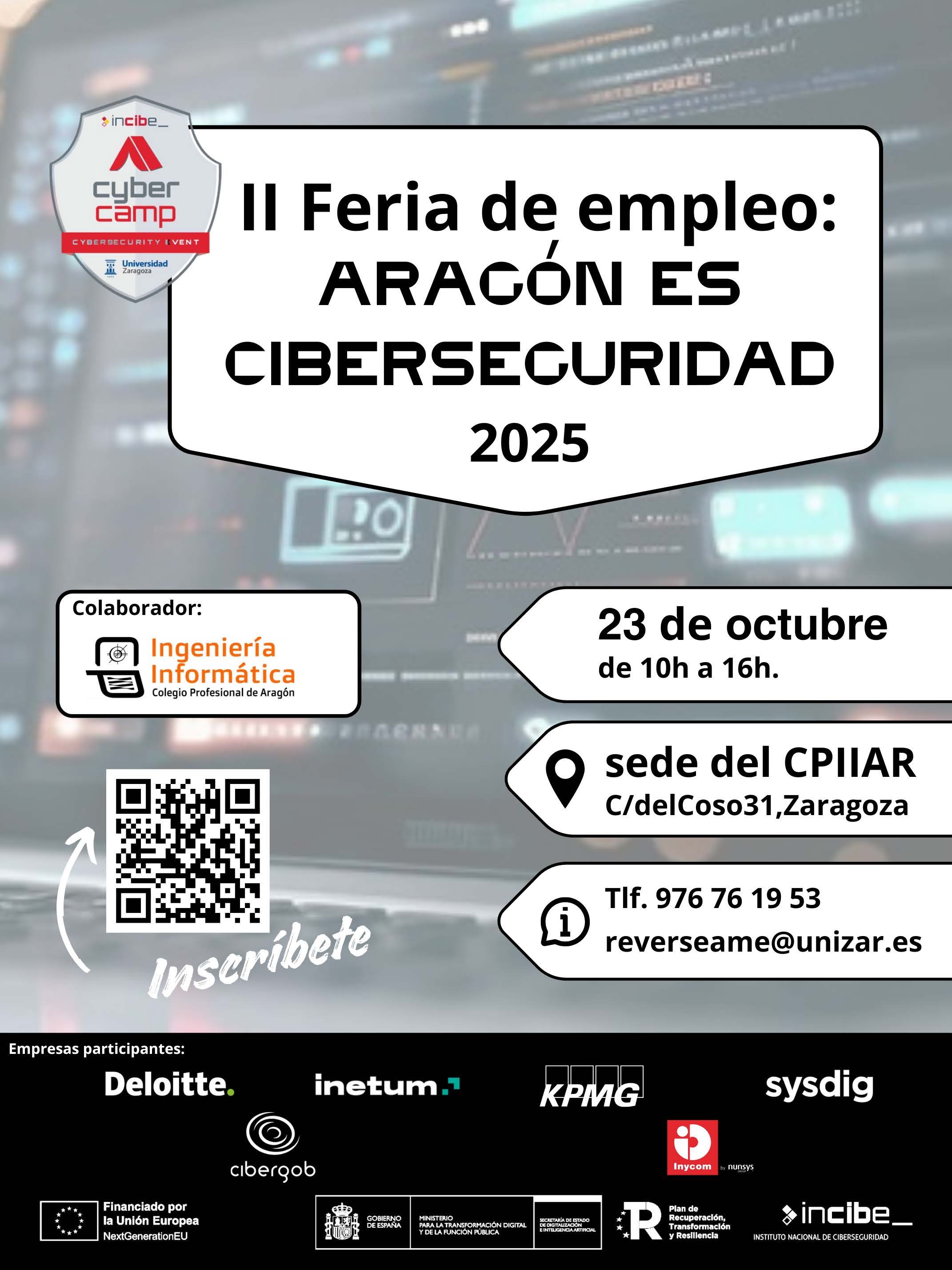 CyberCamp UNIZAR (INCIBE), en colaboración con la Escuela de Ingeniería y Arquitectura de la Universidad de Zaragoza (EINA) y el Colegio Profesional de Ingenieros Técnicos en Informática de Aragón (CPIIAR), organiza la II Feria de Empleo “Aragón es Ciberseguridad”, que se celebrará el 23 de octubre de 2025 en la sede de CPIIAR, en Calle del Coso, 31, en Zaragoza.