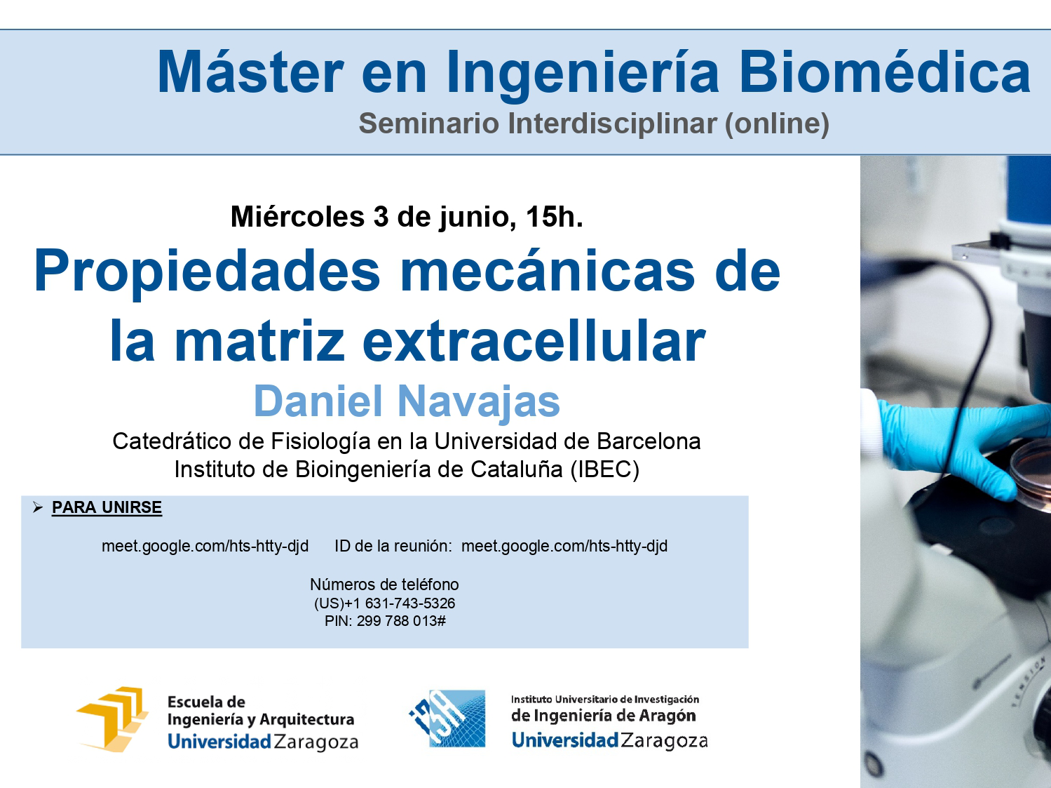 El miércoles 3 de junio, a las 15h, tendrá lugar el seminario (on line) Propiedades mecánicas de la matriz extracellular, impartido por Daniel Navajas (Catedrático de Fisiología. Universidad de Barcelona - Instituto de Bioingeniería de Cataluña, IBEC).